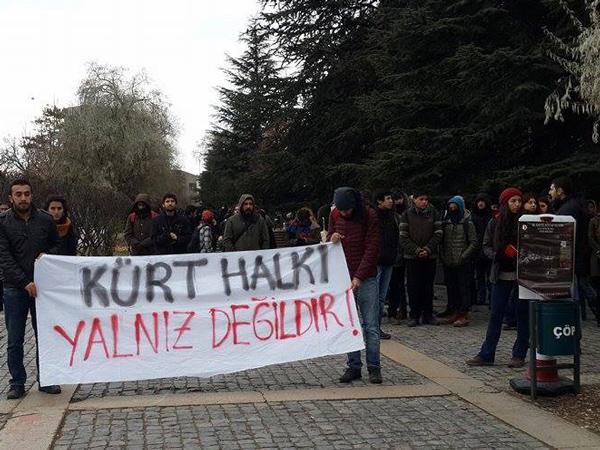 “Bijî Berxwedana Cizire-Silopi-Kürdistan-Kobanê”, “ODTÜ isyandır Kürt halkına selam!”, “Diren Kürdistan ODTÜ seninle!”, “Kürdistan faşizme mezar olacak!”, “Direnen Kürt halkı yalnız değildir!”, “Kürt halkına imha dayatılamaz!”, “Sur içinde düşene dövüşene bin selam!” ve “Bijî biratiya gelan!” sloganları eşliğinde A1 kapısına doğru yürüyen ODTÜ öğrencileri “Kürt halkı uyanmış özgürlüğü alacak / Kürdistan faşizme vallah mezar olacak!” marşını da hep bir ağızdan okudu.
