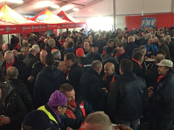 İşçiler grev çadırında toplanmaya başladı. Saat 09.30’da FNV sendika bölge yönetiminden VDL Nedcar sorumlusu Peter Reniers kürsüye çıkarak işçilere yönelik bir konuşma yaptı. Petra kısaca TİS sürecine değindi. Ve şunları söyled: “Patron sendikası FME bugüne kadar anlaşmaya yanaşmadığı için grev ve eylemler devam ediyor. Metal sektörü Hollanda da en fazla kar yapan bir sektör fakat işverenler karlarına daha fazla kar katmak için 0 (sıfır) sözleşme veya düşük bir anlaşma ile süreci idare etmeye çalışıyorlar. Birlikte mücadele edersek mutlaka kazanacağız. Grevler ve eylemler yaygınlaşarak sürecektir.” Ardından dev ekranda Nedcar işçileri ile internet üzerinden canlı bağlantı kuruldu. Karşı tarafta Nedcar işçileri büyük bir coşkuyla dayanışma sloganları atarak biz DAF işçilerini selamladılar. FNV bölge yönetiminden DAF sorumlusu Petra Bolster ekranda DAF işçilerini selamladı ve mücadeleci duruşumuzdan dolayı bizimle gurur duyduğunu söyledi. “Siz DAF işçilerinin tecrübe ve mücadelesini Nedcar işçilerine anlatıyorum, burda da büyük bir coşku ve kakarlılık var. Nedcar işçileri orada grev anında aldıkları kararla 11 Ocak 2016 Pazartesi günü yeniden 24 saat greve gideceğini kararlaştırdılar” dedi. DAF ve Nedcar işçileri birbirini selamlıyarak birlik ve dayanışma sloganları attılar. Nedcar’da binden fazla işçi grev formu doldurarak greve katıldı. DAF’ta 800’den fazla işçi grev formu doldurarak greve katıldı. Ülkesel ve bölgesel düzeyde TV ve basın büyük ilgi gösteriyordu.