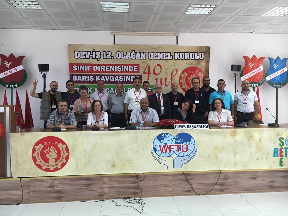 Devrimci İşçi Sendikaları Federasyonu(DEV-İŞ) 12. Olağan Genel Kurulu’nu yaptı. KTAMS konferans salonunda dün 10.30’da başlayan genel kurul toplantısına Sendikal Platform üyesi sendikalar ve siyasi parti temsilcileri yanında, 126 ülkede 90 milyon üyesi olan Dünya Sendikalar Federasyonu Genel Sekreteri Georgio Mavrikos, Türkiye’den, Devrimci İşçi Sendikaları Konfederasyonu DİSK adına Yönetim Kurulu Üyesi Mustafa Safvet Yahyaoğlu, DİSK’e bağlı Birleşik Metal-İş Sendikası Başkanı Adnan Serdaroğlu, DİSK’e bağlı Sosyal-İş Sendikası Başkanı Metin Ebetürk, Güneydoğu Avrupa Bölgesel Enerji Sendikaları Ağı (RETUN-SEE) Genel Sekreter Yardımcısı Panagiotis Kantousiadis, Güney Kıbrıs’tan ise PEO Sendikası Genel Sekreteri Pambis Kritsis Başkanlığında PEO delegasyonu katıldı.