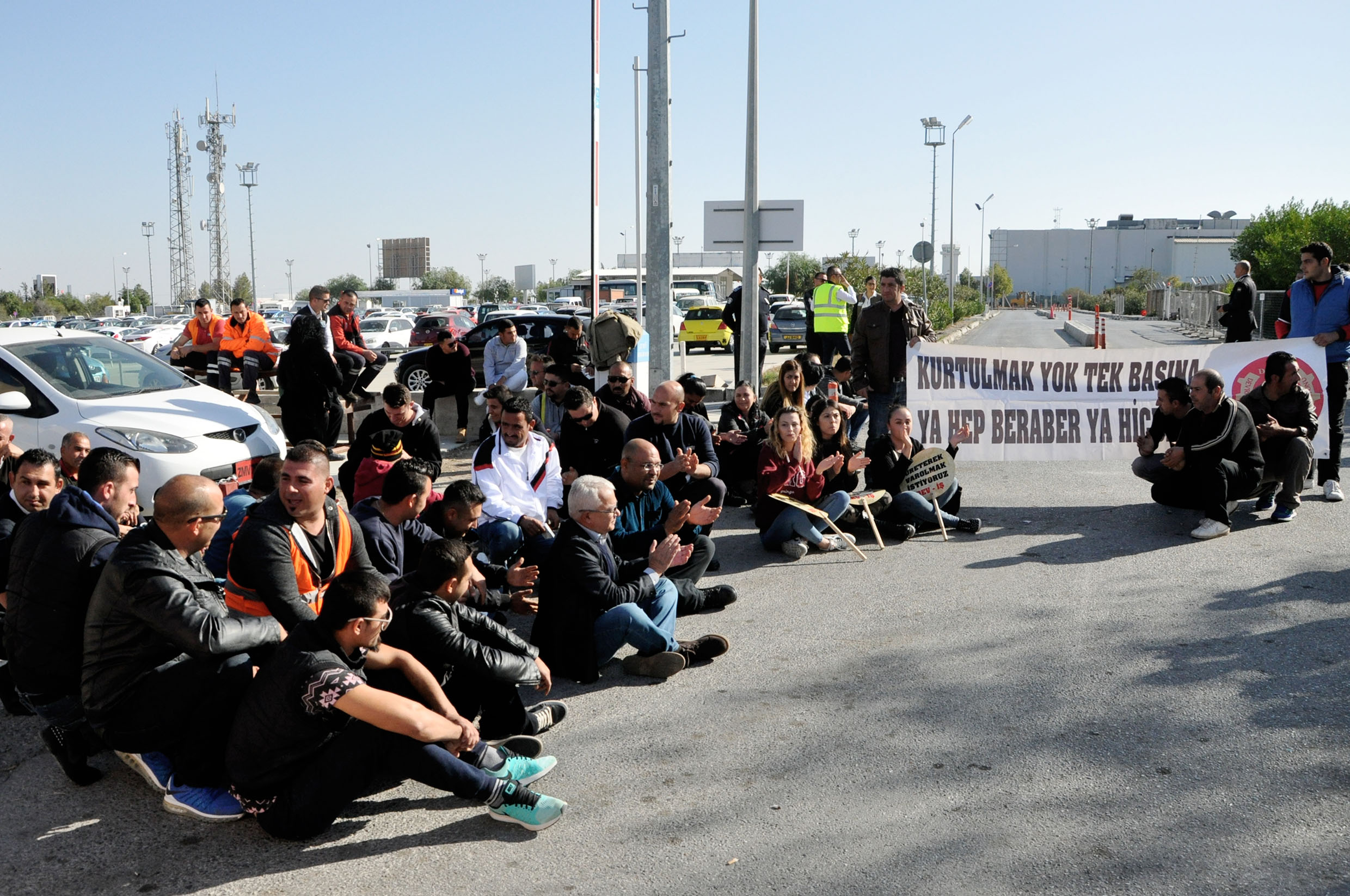 Dev-İş ve Emek-İş, Ercan Havaalanı’da hizmet veren Cyprus AirPort Services’te (CAS) 13 kişinin işten durdurulmasını protesto etti ve oturma eylemi yaptı.