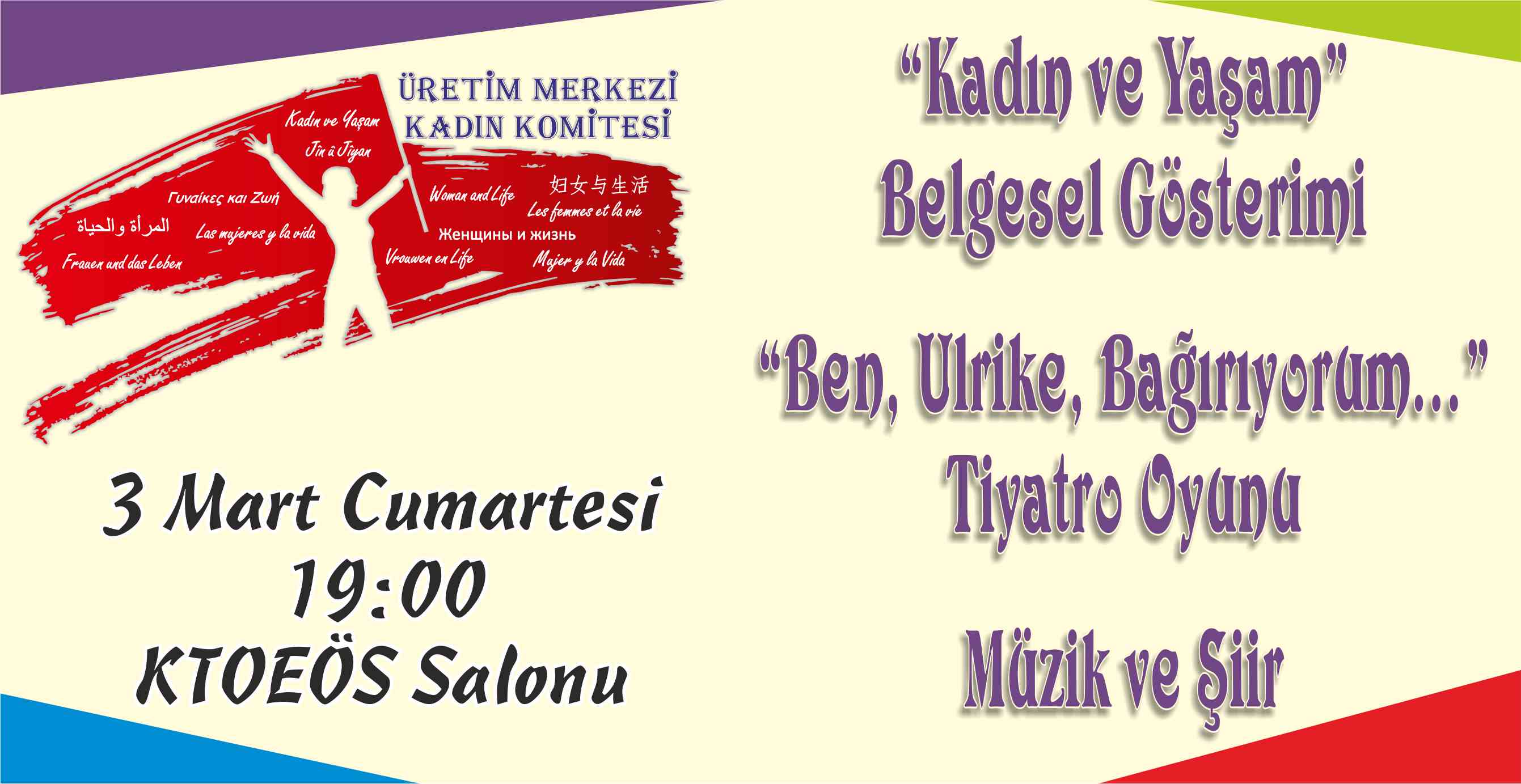 Üretim Merkezi 8 Mart Dünya Emekçi Kadınlar Günü öncesinde, 3 Mart Cumartesi gecesi saat 19:00’da Kıbrıs Türk Orta Eğitim Öğretmenler Sendikası Konferans Salonu’nda belgesel, tiyatro, müzik ve şiirlerden oluşan bir etkinlik düzenliyor.