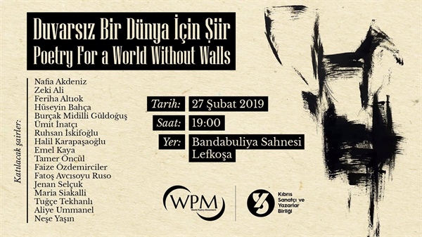 Kıbrıs Sanatçı ve Yazarlar Birliği’nden verilen bilgiye göre, Şubat ayı boyunca dünyanın çeşitli ülkelerinde düzenlenen “Duvara Karşı Şiir” etkinliklerinde dünyadaki sınırlar, milliyetçi ve etnik ayrımcılıkla oluşturulan fiziki ve psikolojik duvarlar protesto ediliyor.