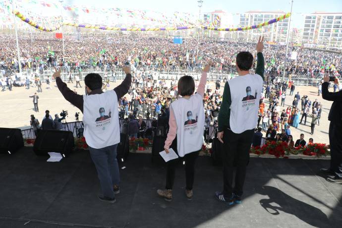 Batman’da on binlerce kişi, PKK lideri Abdullah Öcalan üzerindeki tecridin kaldırılması talebiyle süresiz dönüşümsüz açlık grevinde bulunan DTK Eş Başkanı Leyla Güven ve Nasır Yağız’ın fotoğraflarının bulunduğu tişörtlerle Newroz kutlamasına katıldı.