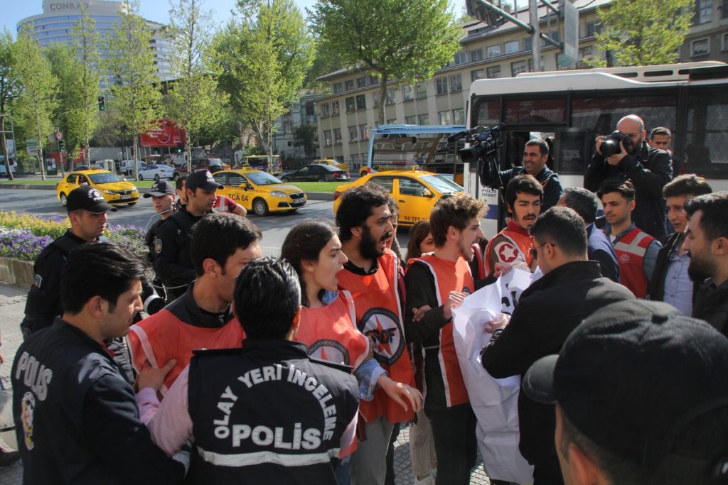 Mecidiyeköy’den Taksim’e doğru yürüyüşe geçtiğimizde polisin müdehalesiyle karşılaştık. 5 sendikamız yöneticisi ve işçi arkadaşımız gözaltına alındı. pic.twitter.com/37mTeWb7Zu