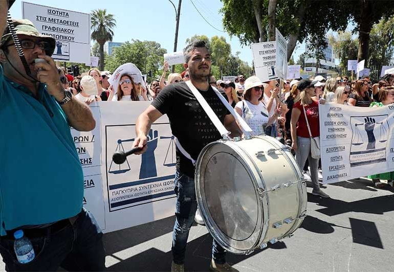 Kıbrıs Cumhuriyeti’ne bağlı kamu sektöründe sözleşmeli çalışanların sürdürdüğü grevin ikinci gününde işçiler Maliye Bakanlığı’ndan Temsilciler Meclisi’ne ve ardından Yüksek Mahkeme’ye yürüdükten sonra süresiz greve başlama uyarısında bulundular.