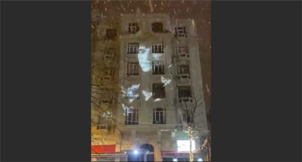 Agos gazetesinin eski yeri olan Şişli’deki Sebat Apartmanı’na projeksiyonla Hrant Dink ve güvercin görüntüleri yansıldı.