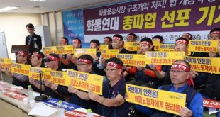 Güney Kore’de demiryolu işçilerinin süresiz grevinin ardından kamyon sürücüleri de Pazartesi gece yarısından itibaren karayolu taşımacılığını önemli oranda sekteye uğratacak bir greve başlama tehdidinde bulundular. Hükümet yasa dışı ilan ettiği greve karşı çok sert tedbirler alınması ve lojistik sektörüne yedek işçi alınarak grevin etkilerinin azaltılması yönünde talimat verdi. Taşımacılık sendikasından …